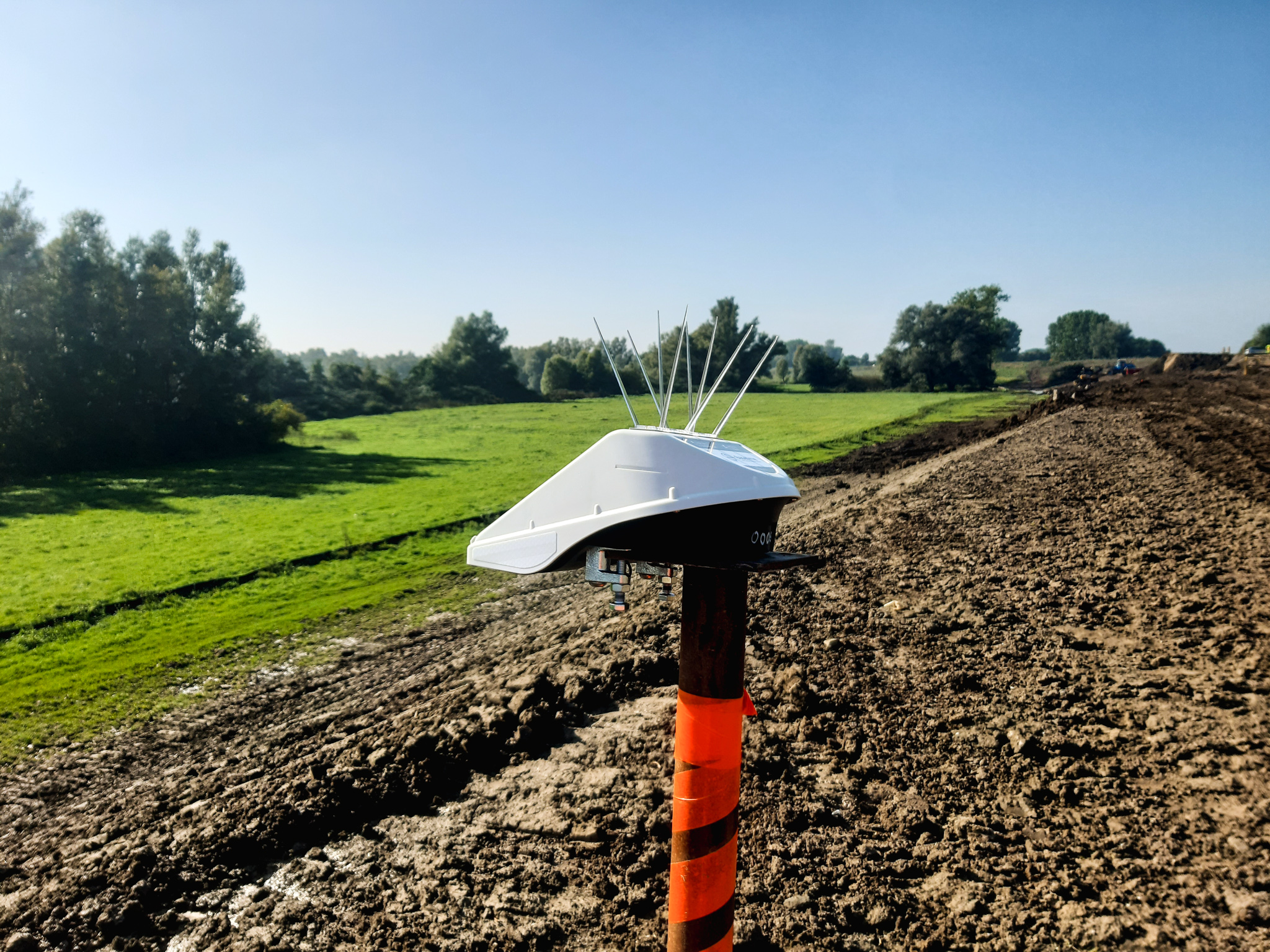 התקנה – מספר של חיישני Locator One מותקנים על מוטות כדי לקבוע את גובה לוחות הבסיס, הממוקמים במפלס הקרקע המקורי.